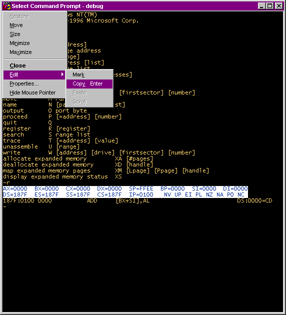 The DOS command window has a "cut-&-paste" clipboard that works differently than most applications. To use it: