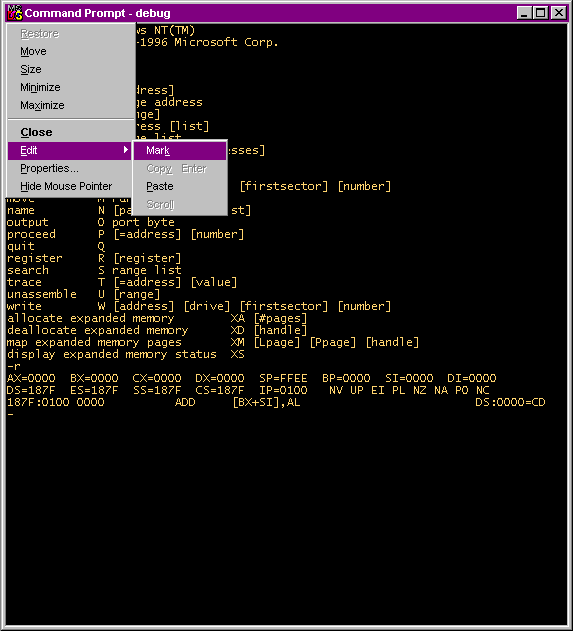 Click the "MS" icon at the upper left in the window's title bar. Select Edit / Mark.